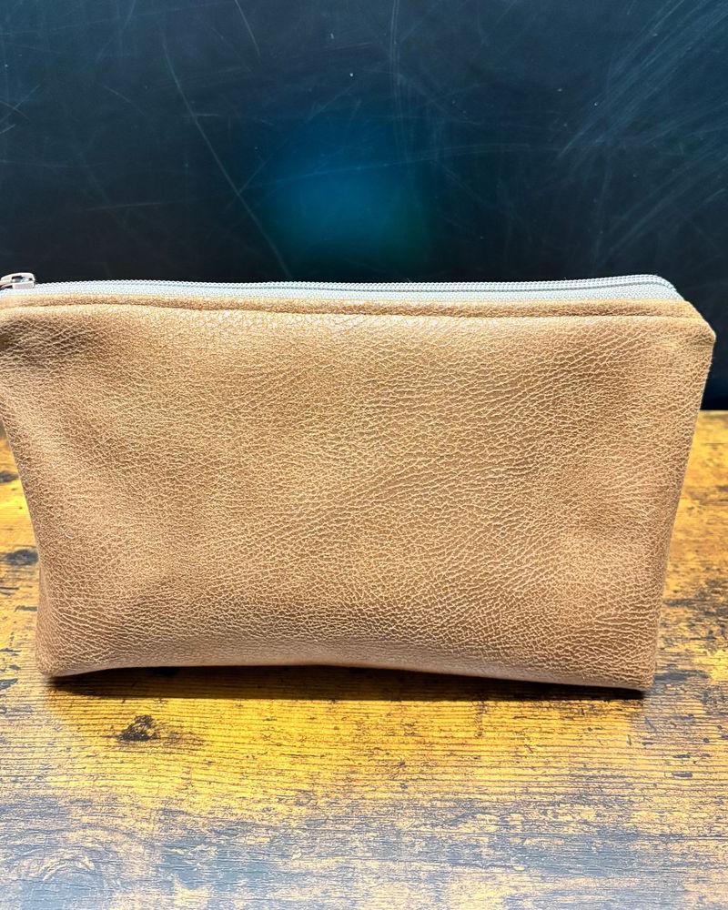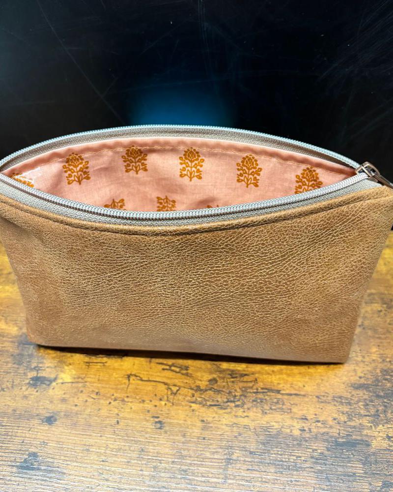 Dieses wunderschöne Necessaire besteht aus hochwertigem Lederimitat aus recyceltem Leder und überzeugt durch seine edle Haptik. Das gemusterte Innenfutter aus pfirsich-rostorangefarbenem Wachstuch setzt einen stilvollen Akzent. Der braune Reißverschluss mit Metallzipper und roséfarbenen Zähnen rundet das Design elegant ab.