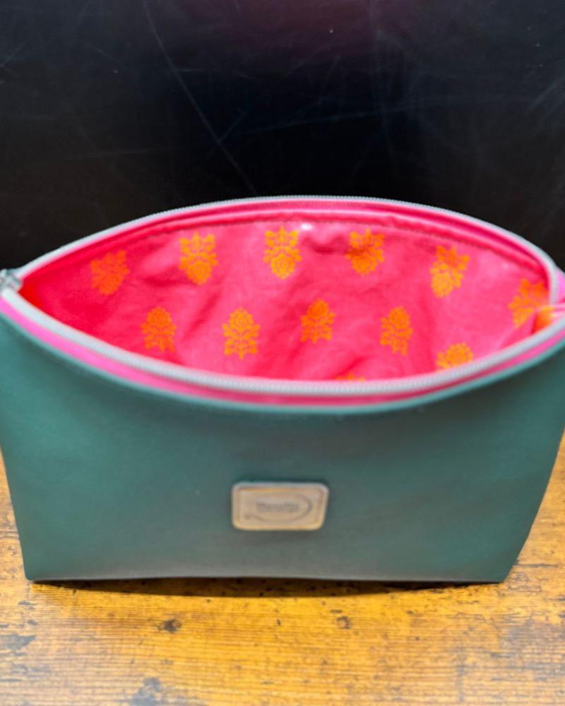 Das Material ist nicht nur besonders schön, sondern auch robust und pflegeleicht, ideal für den täglichen Gebrauch. Innen schützt ein Wachstuch mit pink-orangem Muster den Inhalt zuverlässig und lässt sich leicht reinigen. Der pinke Reißverschluss mit silbernen Zähnen und hochwertigem Metallzipper setzt einen edlen Akzent und verleiht dem Necessaire eine zeitlose Eleganz.